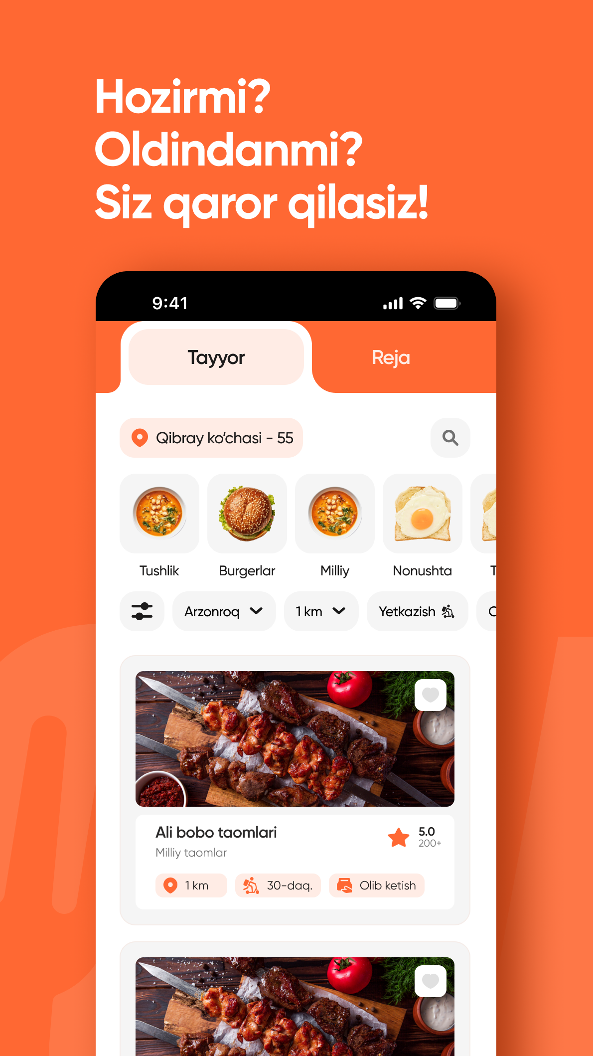 Restoranlar, catering xizmatlari va kunlik tayyor taom paketlarini bir joyda toping.